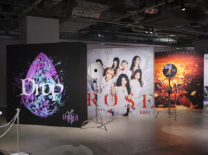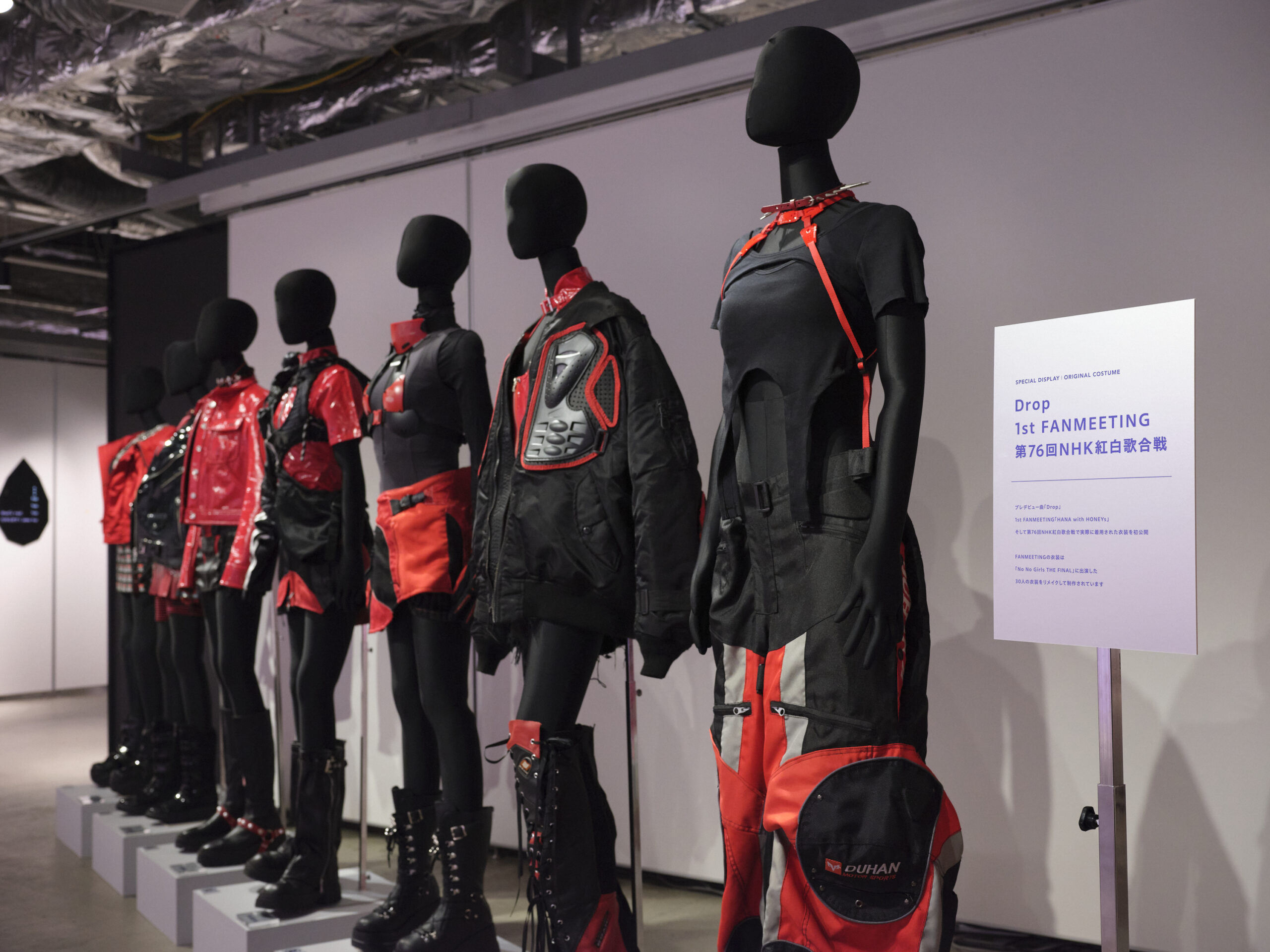 衣装展示は3種類。プレデビュー曲『Drop』のほか、ファーストファンミーティング、第76回NHK紅白歌合戦でメンバーが実際に着用した衣装が展示されていました。