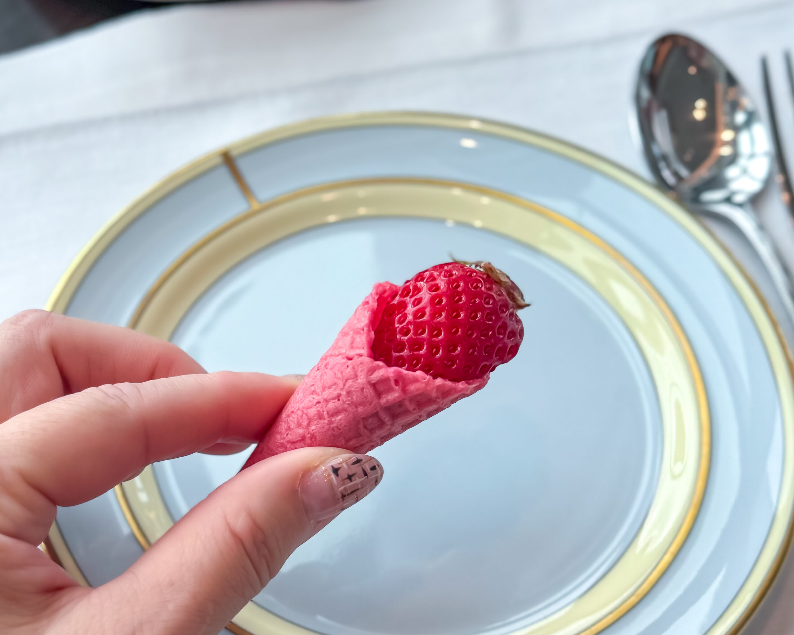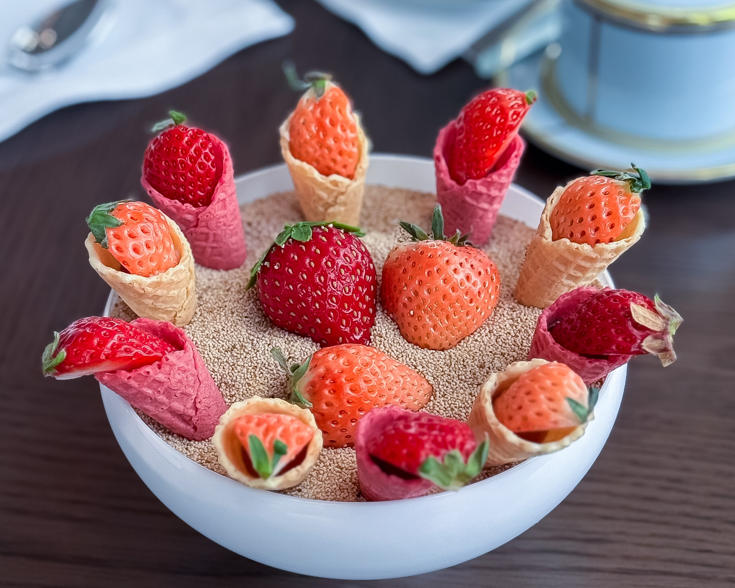 まずは可愛いコルネ状のいちごスイーツが運ばれてきます。ワッフルコーンにショコラとあまおう、ルバーブと淡雪を合わせてあり、どちらも苺の芳醇な香りと深みのある甘みが楽しめます。