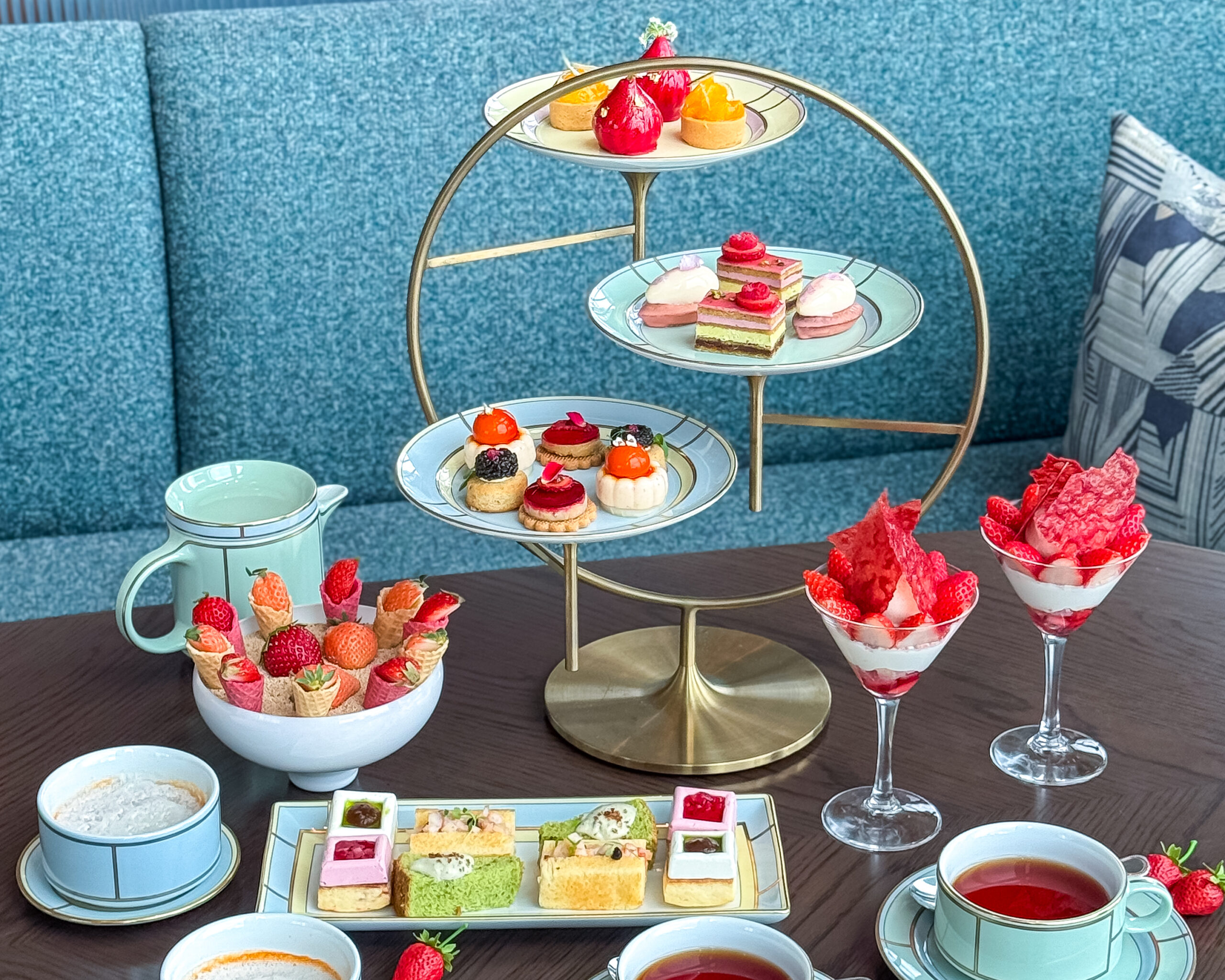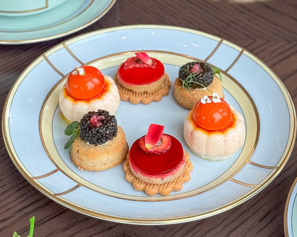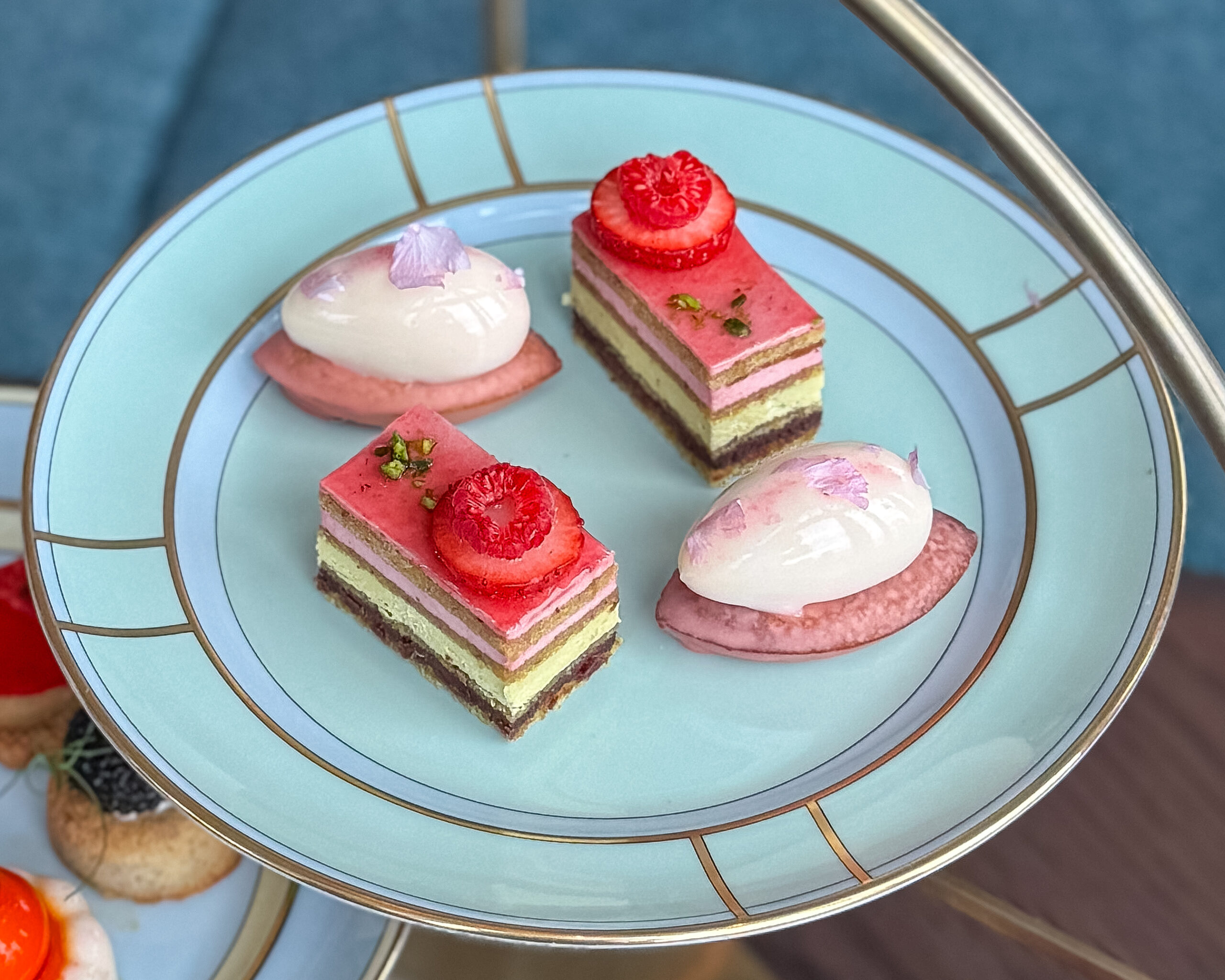 ケーキスタンドには苺や爽柑橘系フルーツを使用した、カラフルで上品な甘さのスイーツが並んでいます。オペラはいちごとピスタチオのバランスがよく、甘いのにとても爽やかな味わい。