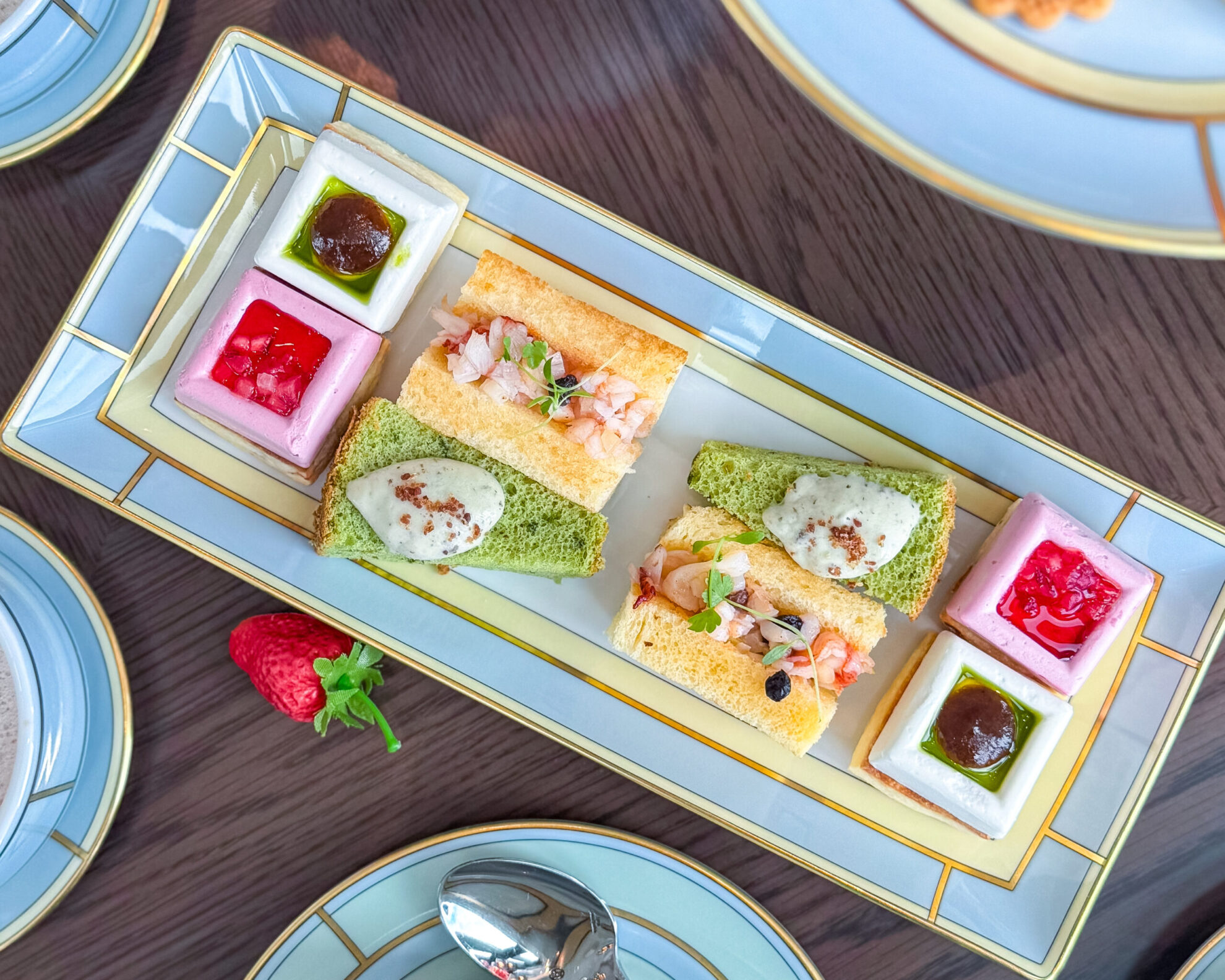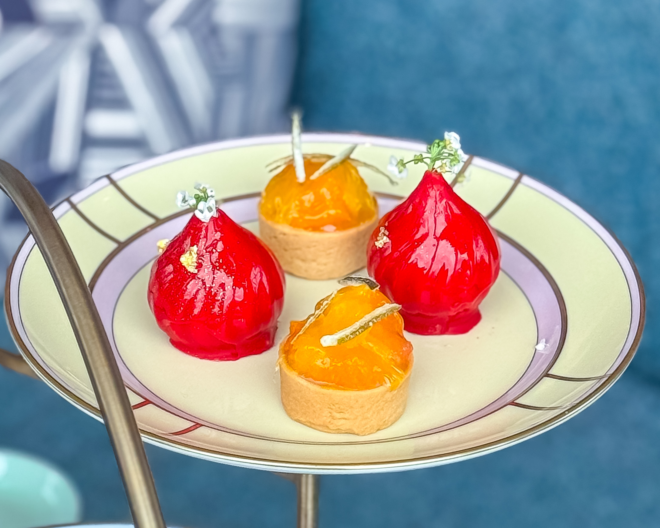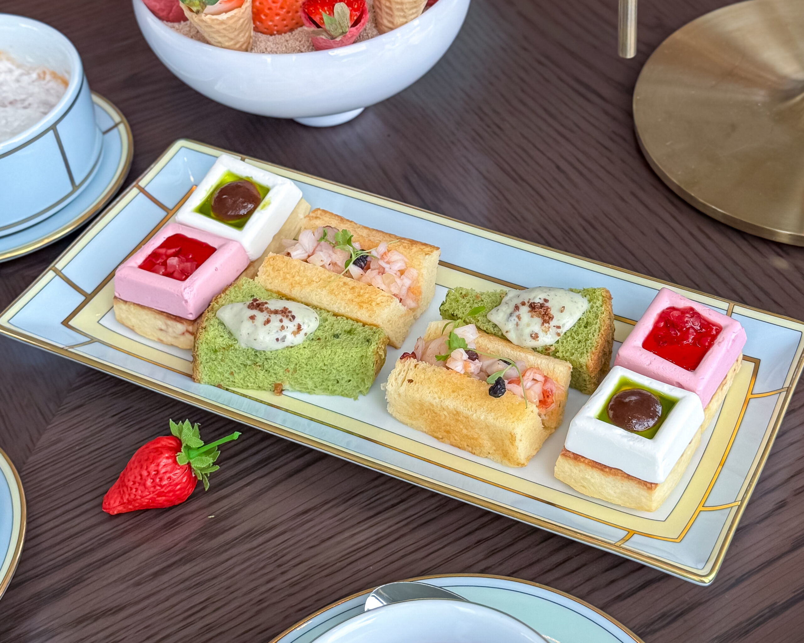 ケーキスタンドには苺や爽柑橘系フルーツを使用した、カラフルで上品な甘さのスイーツが並んでいます。オペラはいちごとピスタチオのバランスがよく、甘いのにとても爽やかな味わい。