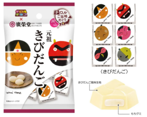 「岡山 きびだんご(チロルチョコ×廣榮堂)」は、優しい甘味のきびだんご風味の生地にもちグミが入っているお菓子で、素材の旨味が生きている素朴な味わいの廣榮堂のきびだんごが忠実に再現されているそうです。絵本作家・五味太郎氏のかわいいイラストデザインも特徴的です。