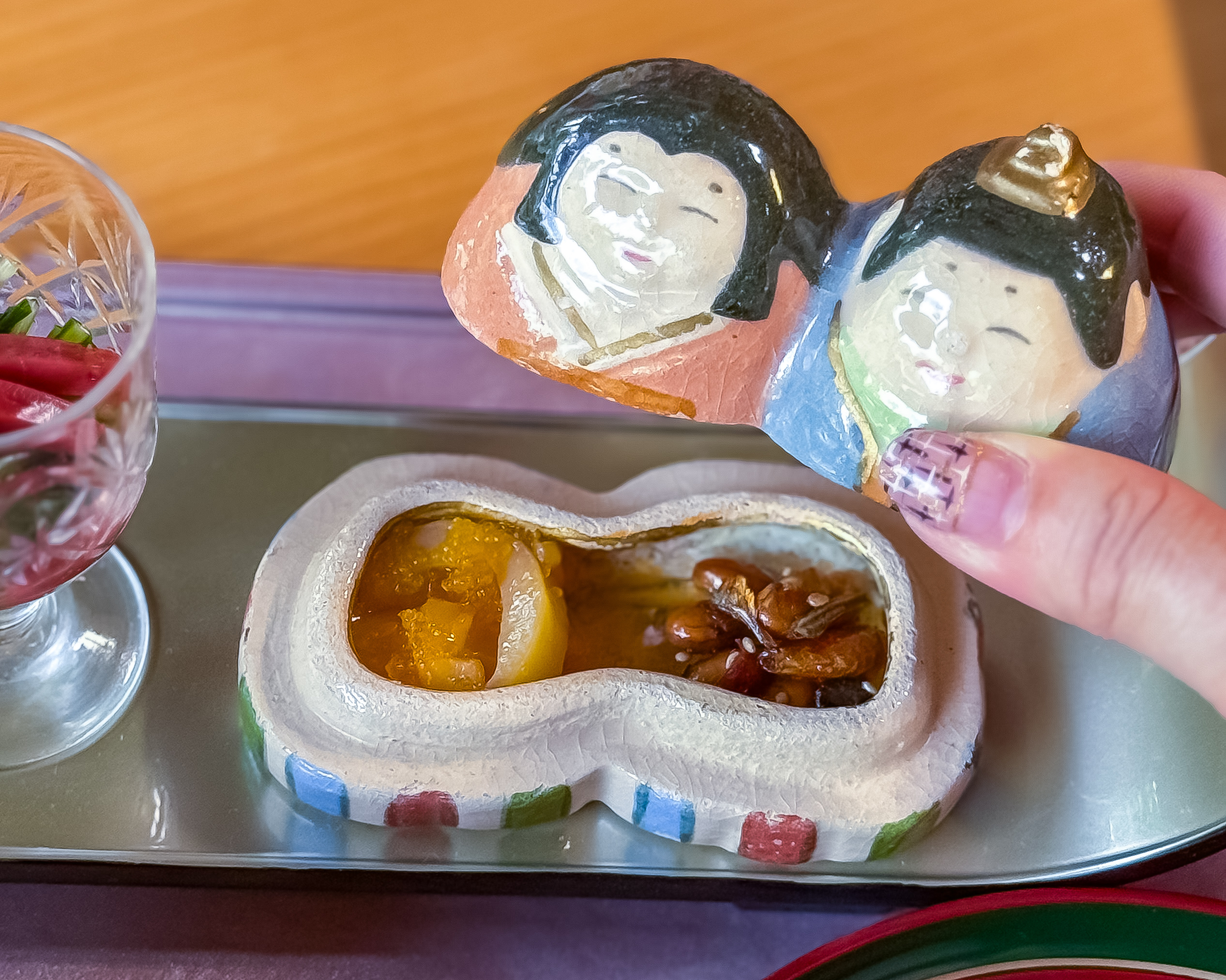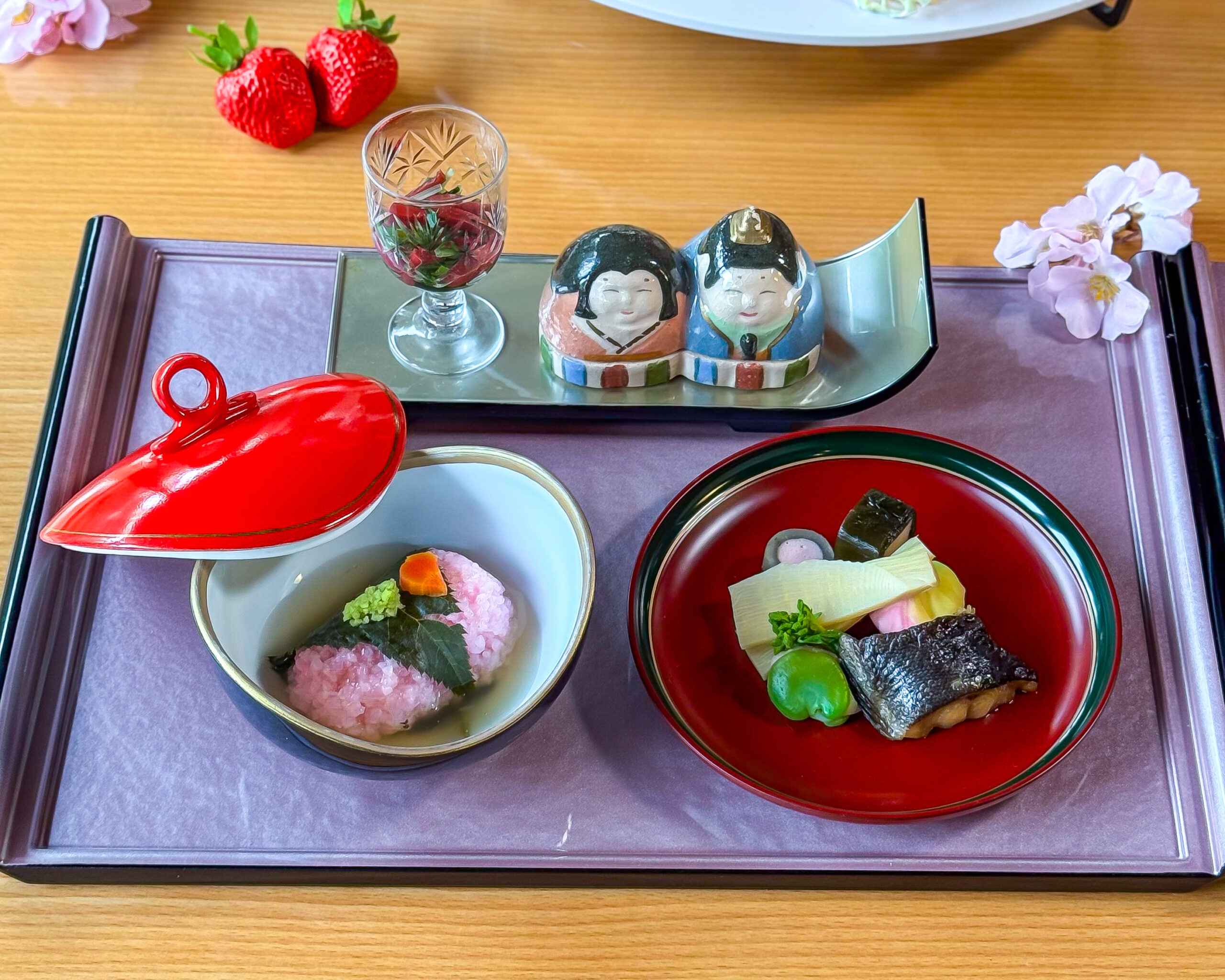 京料理店ならではの春を感じる食材や、料理人さんの技術の高さでふっくら焼き上がった焼き魚、そしてお雛様の器など、趣向を凝らしたセイボリーが並びます。