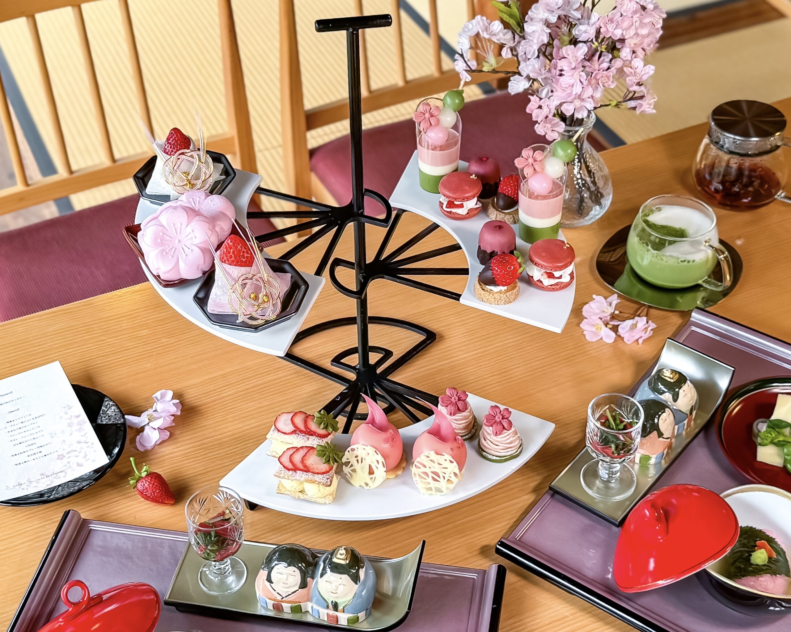 キュン、とくる可愛いミニ三色団子や桜のチョコ、イチゴを贅沢に使用したマカロンケーキやミルフィーユなど、春色に染まるラインナップです。