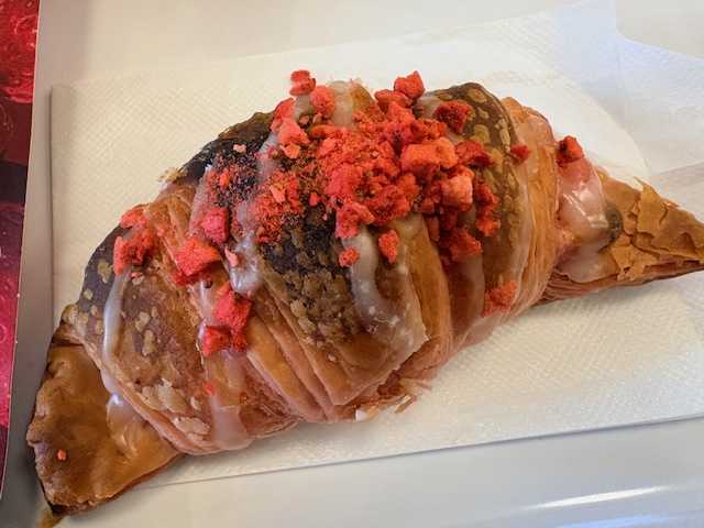 食べてみるとサクサクしたクロワッサン生地がいちご風味になっていて、中にはいちご顆粒入りチョコレート、上にはドライいちごがトッピングされ、まさにいちごづくし!