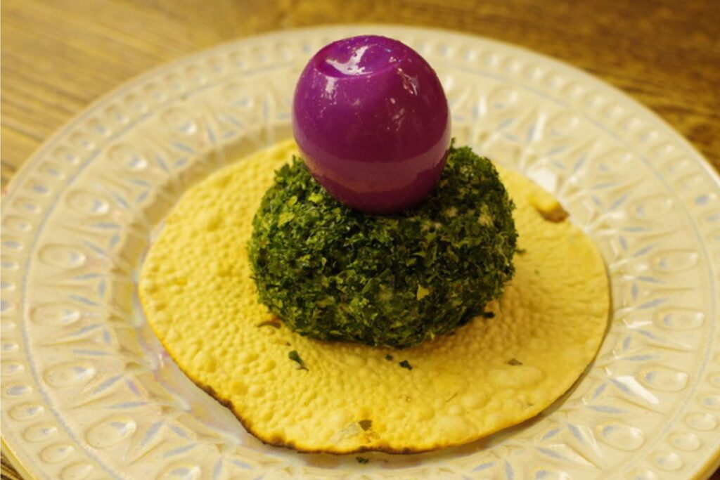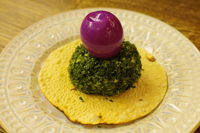 ポテサラは、運ばれてきて驚くのがそのビジュアル!表面にはたっぷりの「あおさ」がまぶされ、鮮やかな緑色。その上にはアチャール(漬物)液に浸かった紫色のゆで卵が鎮座しています。