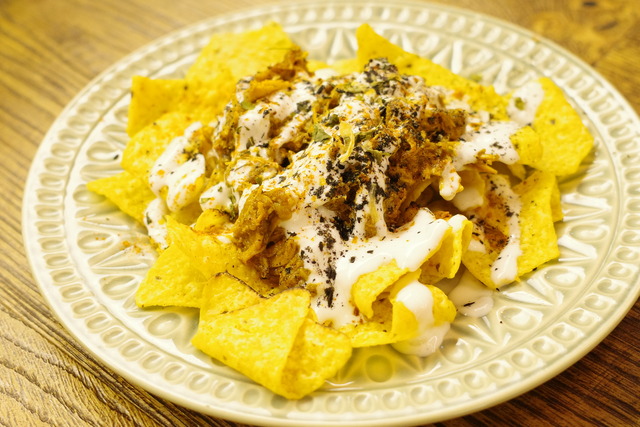 トルティーヤにかけられた特製ナチョスソースは、鶏肉の旨みが効いたスパイシーな仕上がり。パリッとした食感と濃厚なソースの組み合わせは、クラフトビールの最高のアテになります。