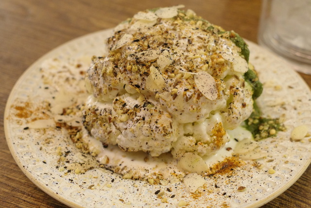 タンドール釜でじっくり焼かれた「丸ごとカリフラワー」も、このお店らしい遊び心に溢れています。 面白いのがそのソース。爽やかなグリーンのミントソースと、まろやかな白いヨーグルトソースが、贅沢に半分ずつかけられているんです。
