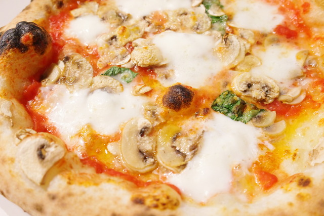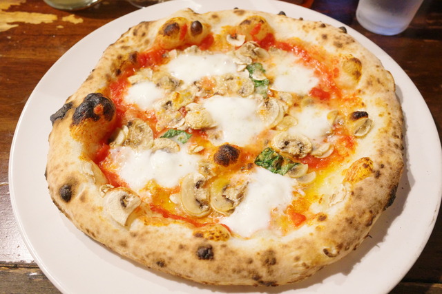 焼き立てが運ばれてきた瞬間、マッシュルームの芳醇な香りがテーブルいっぱいに広がります。こちらの生地は、クリスピー過ぎず、かといって分厚いふわふわ系でもない、絶妙な薄めのモチモチ感。ソフトな食感の生地に、瑞々しいソースとスッキリとした水牛モッツァレラが実によく馴染みます。