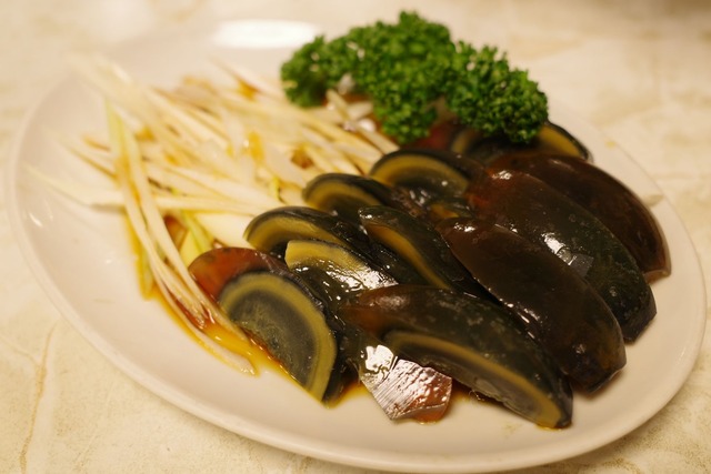 席につき、まずは「ピータン」をオーダー。ここのピータンは、クセが強すぎず、それでいて独特のコクがしっかりと感じられる一品です。