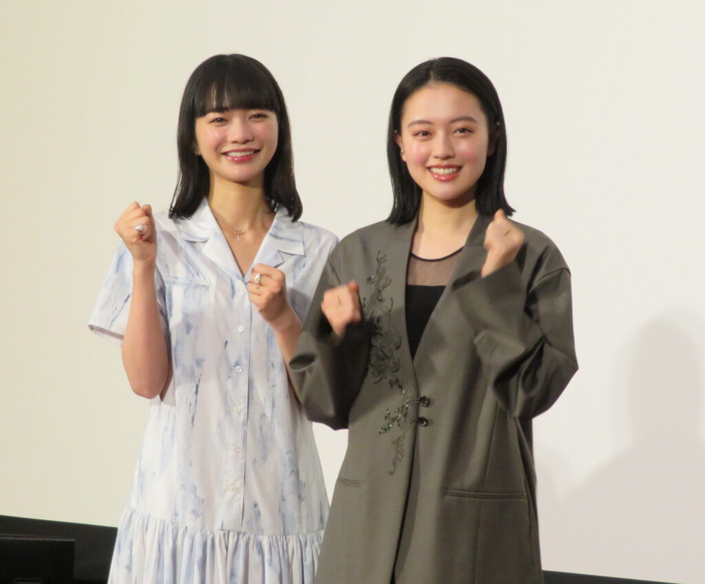 NHK連続テレビ小説「風、薫る」の第1週完成披露試写会に出席した左から見上愛さん、上坂樹里さん