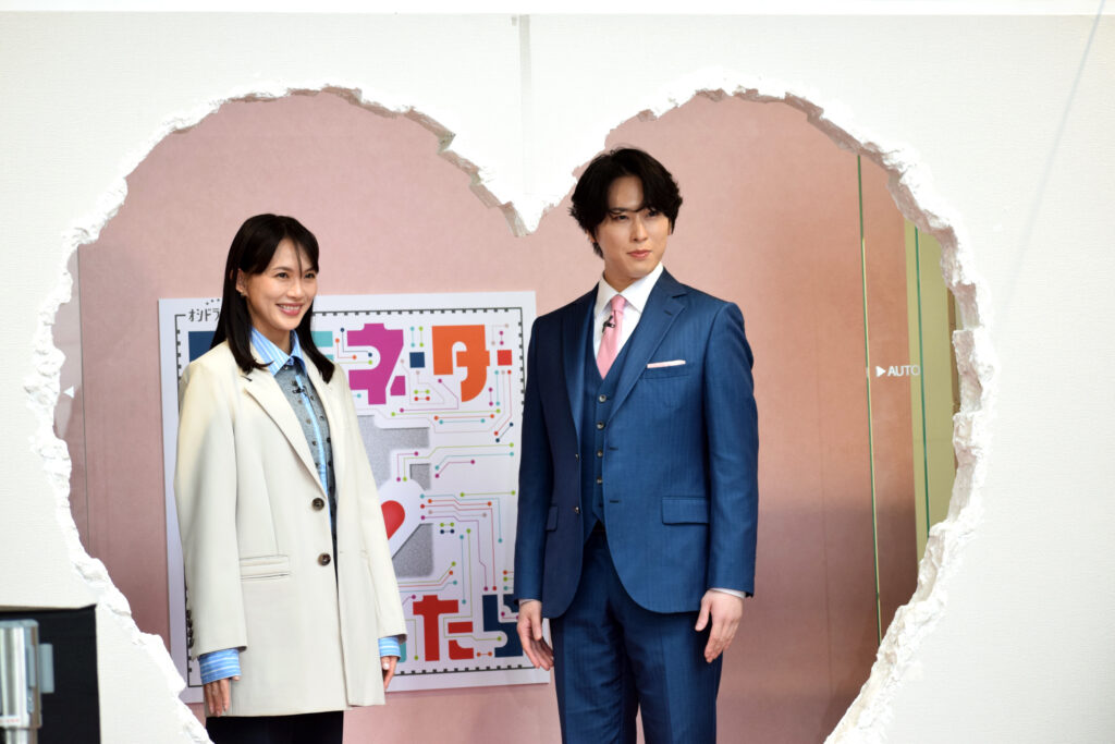 テレビ朝日系『ターミネーターと恋しちゃったら』の会見に出席した(左から)臼田あさ美さん、宮舘涼太さん =東京・港区