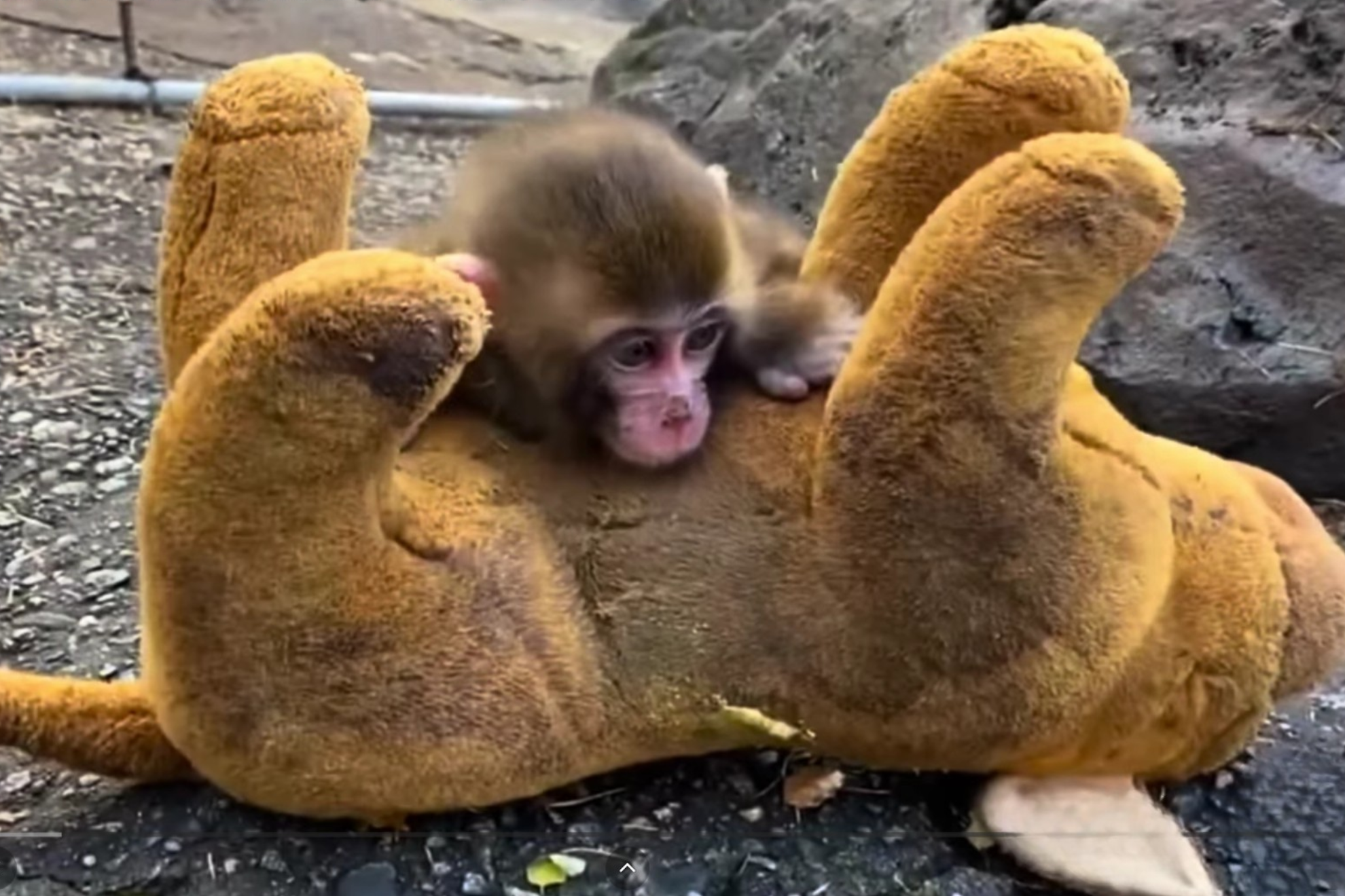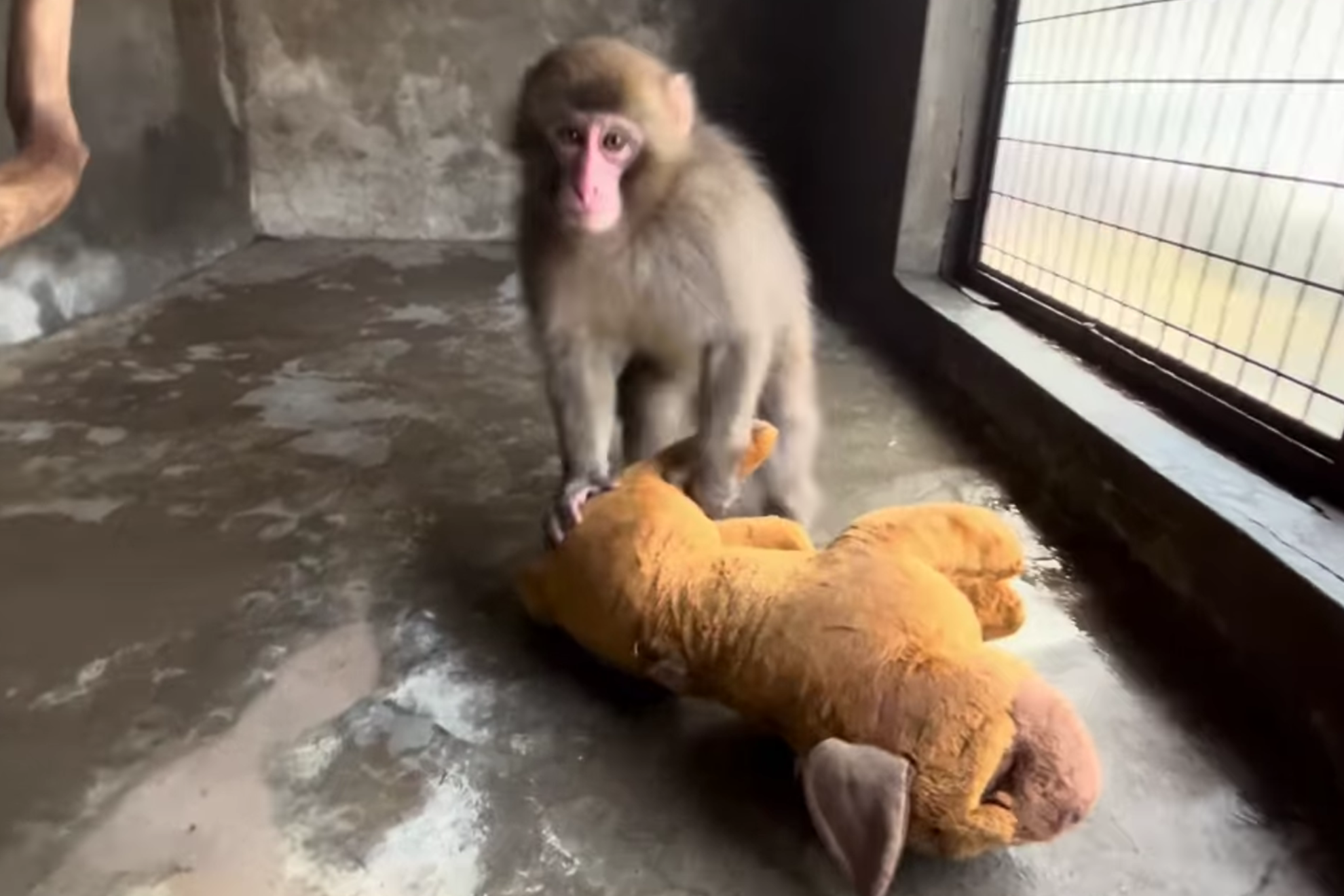 先日、飼育員さんの遊び心で、赤ちゃんのときにしがみついていたイヌのぬいぐるみとモン吉を、久しぶりに再会させるという試みが行われました。