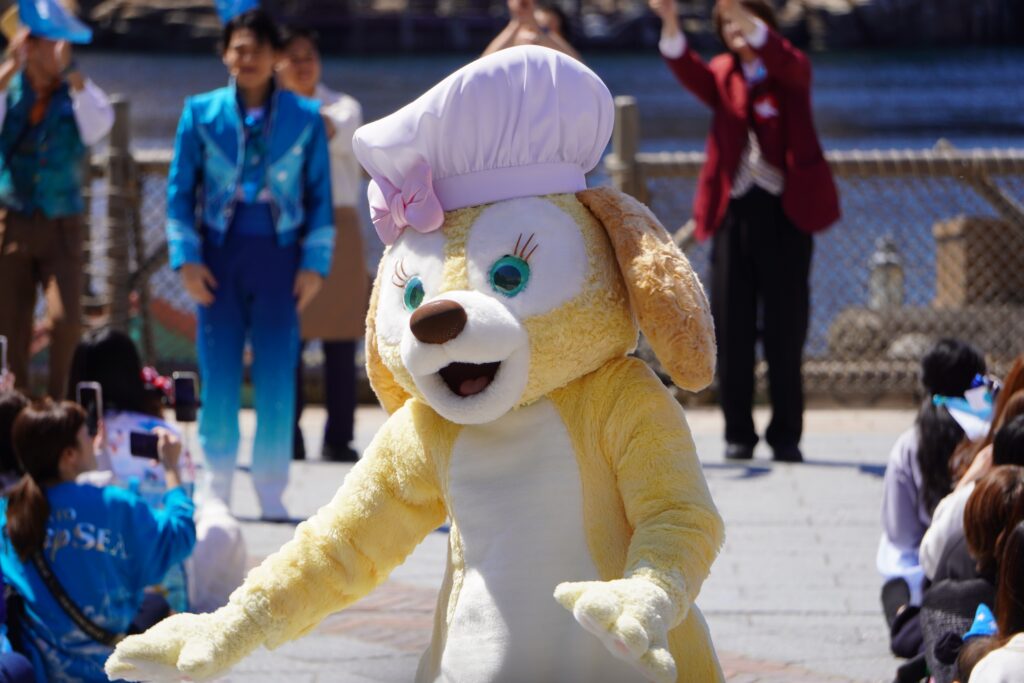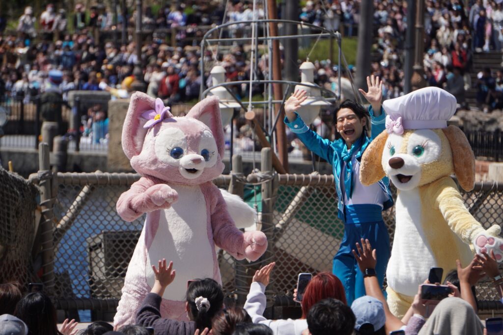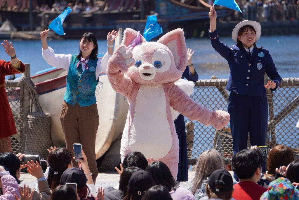 海上ではパイロが華やかに打ち上がり、陸上にはさまざまなコスチュームのキャストが登場。25周年のフラッグを振りながら、簡単なセレブレーションダンスをゲストと一緒に楽しみます。キャラクターたちがゲストの近くまで訪れ、祝福のひとときを共有します。