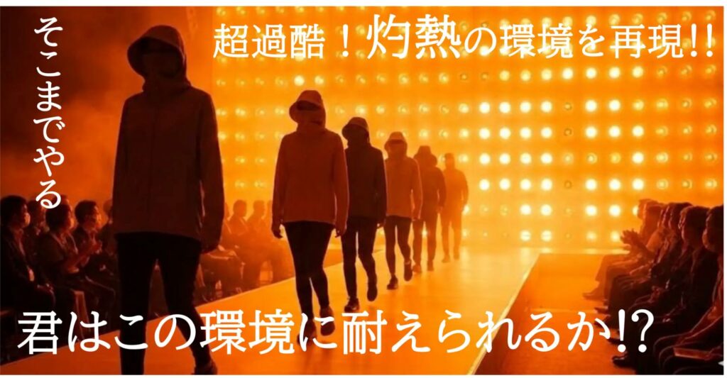 最大の見どころは、「45℃サバイバル」をイメージした『災害級気温45℃‼生存できるかファッションショー』。リアルな酷暑環境を再現したステージ上をUVカットパーカーや、暑熱軽減ウェア「XShelter」を着用したモデルたちが次々と登場し、その機能性をアピールしました。このやりすぎ演出により、客席にせり出したランウェイ周りの1列目では熱気がこもるため、観客にもXShelterや半導体を使った直冷方式のベストの貸出が行われたのだとか。