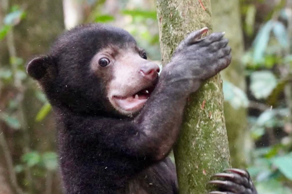 2026年4月、マンジャは大きな一歩を踏み出しました。保護当時2.2キロだった体重が4.2キロへ倍増し、体力が充実してきたマンジャ。自力で高さ約3メートルの木に登るまで成長しました。マレーグマは一生の多くを樹上で過ごすため、野生に戻るために木登りが欠かせないのです。