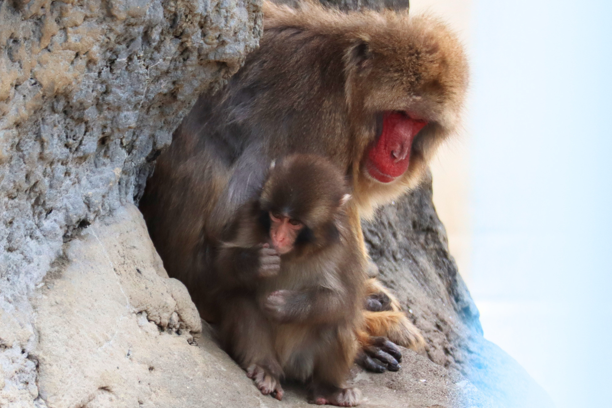 大人のサルたちへのアプローチも積極的です。自分よりも体の大きなサルでも気にせず無邪気にじゃれついたり、背中にひょいと飛び乗ったり。ときには「しつこい!」と怒られてしまうこともありますが、それもサル山の群れのルールを学ぶ大切なコミュニケーションです。