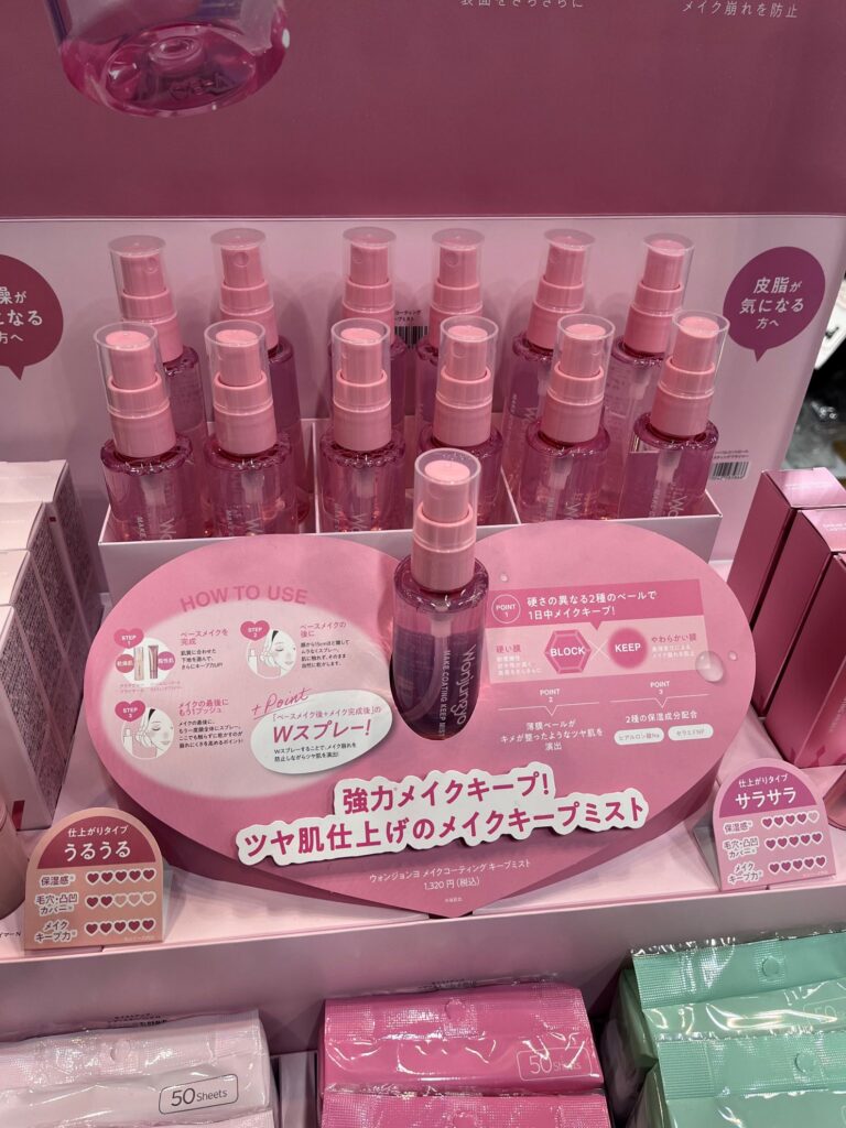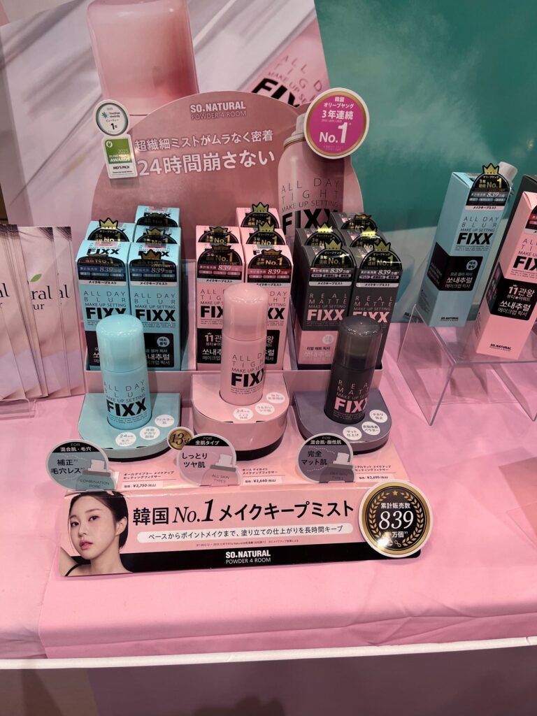 韓国アイドルのメイクなどを担当しているメイクアップアーティストが監修しているブランド「Wonjungyo」からは2種類のベースでメイクを崩れにくくし、今流行のツヤ肌へ仕上げてくれる「メイクコーティング キープミスト」、SNSでも大人気の「So Natural」からは仕上がりが異なるフィックスミストが用意されていました。