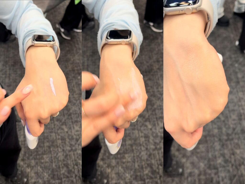 手元で試して一番驚いたのが、このクリーム、見た目はパープルでよくあるトーンアップの日焼け止めかな、と思ったのですが、塗り広げてみてびっくり。