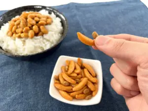 納豆はフリーズドライで乾燥しているため、特有のネバネバもなく、つまんで食べることができるそう。