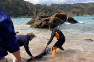 漂着したスジイルカ、沖に届けるも再度波打ち際へ 下田海中水族館で治療続く